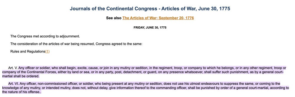 Art. V. Any officer or soldier, who shall begin, excite, cause, or join in any mutiny or sedition, in the regiment, troop, or company to which he belongs, or in any other regiment, troop or company of the Continental Forces, either by land or sea, or in any party, post, detachment, or guard, on any presence whatsoever, shall suffer such punishment, as by a general court-martial shall be ordered.